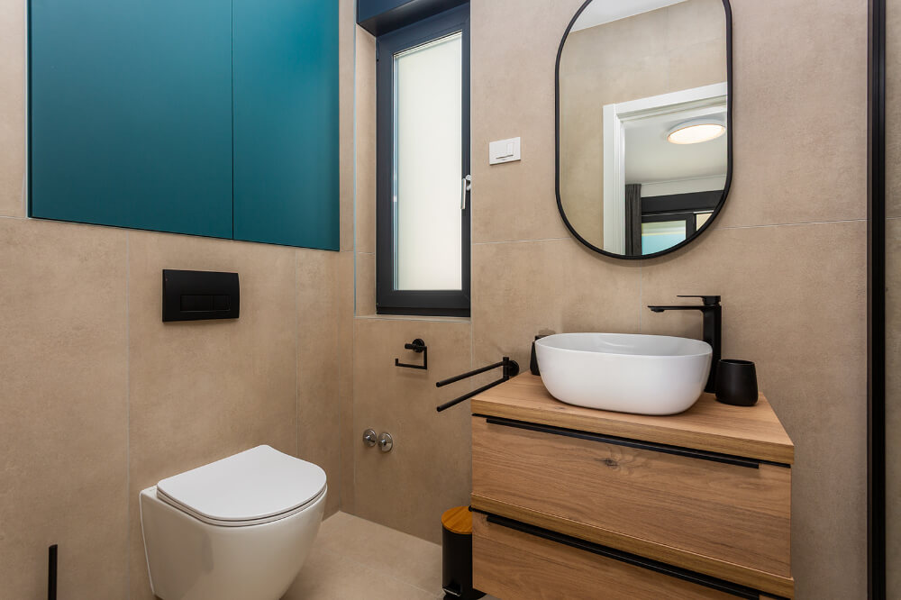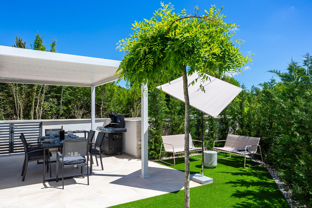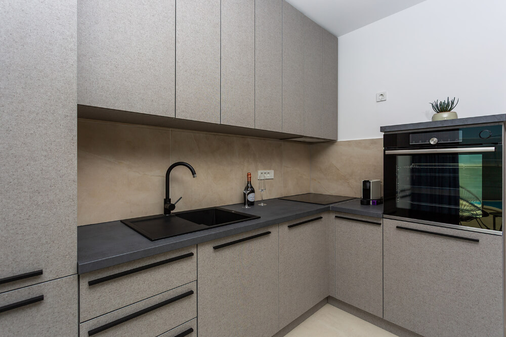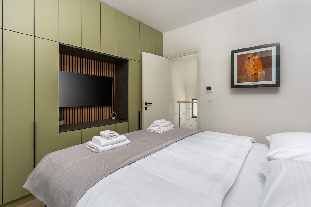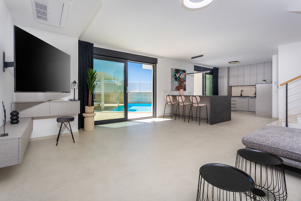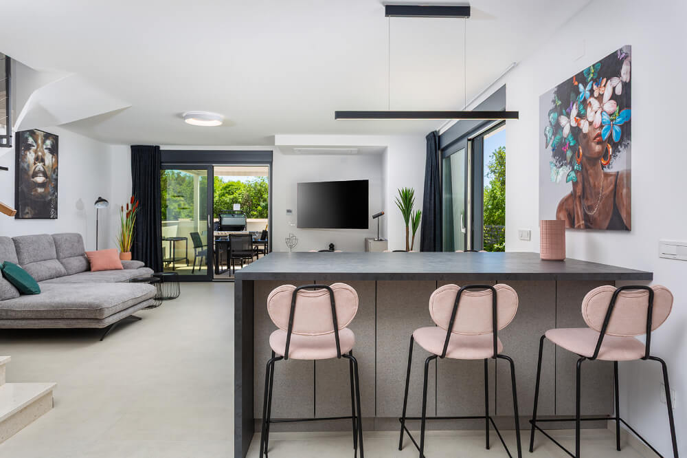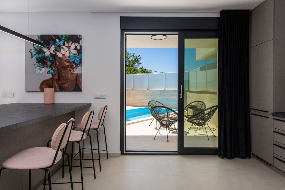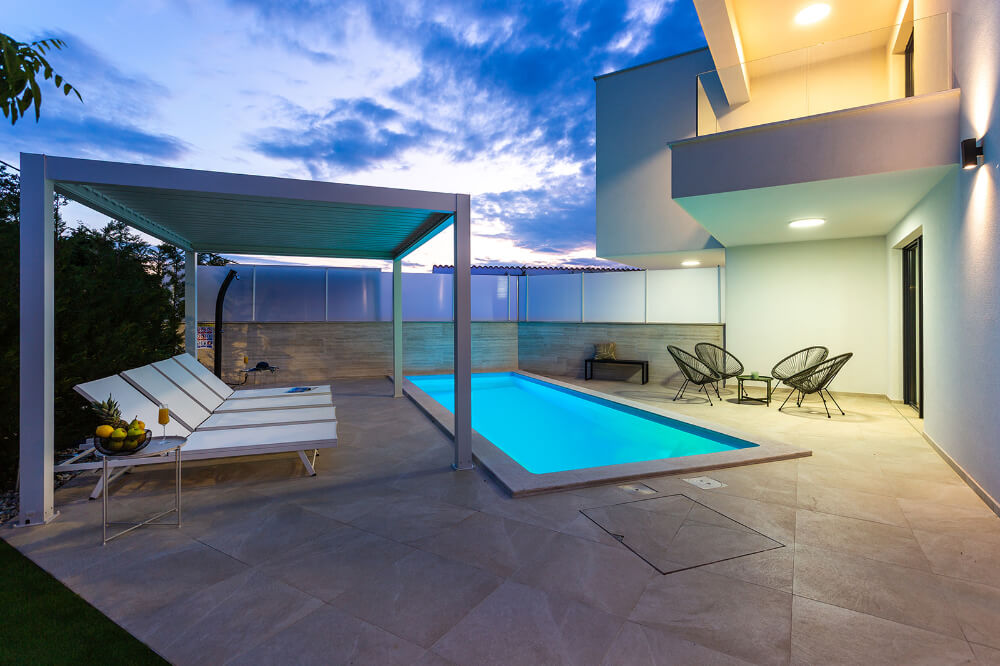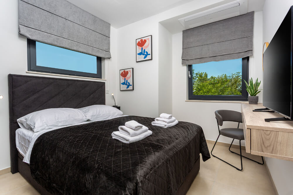 Villa ima 120m2, sastoji se od tri spavaće sobe, glavna spavaća soba s balkonom ima svoju kupaonicu, a ostale dvije spavaće sobe imaju zajedničku veliku kupaonicu. Vila je klimatizirana i ima besplatni WI-FI, a sveukupno može primiti osam osoba (6+1). Ispred vile je osiguran parking za dva automobila. U prizemlju vile nalazi se dnevni boravak, potpuno opremljena kuhinja (perilica za suđe, hladnjak s dubokim zamrzavanjem, toster, kuhalo za vodu, aparat za kavu..) blagovaonica i toalet.